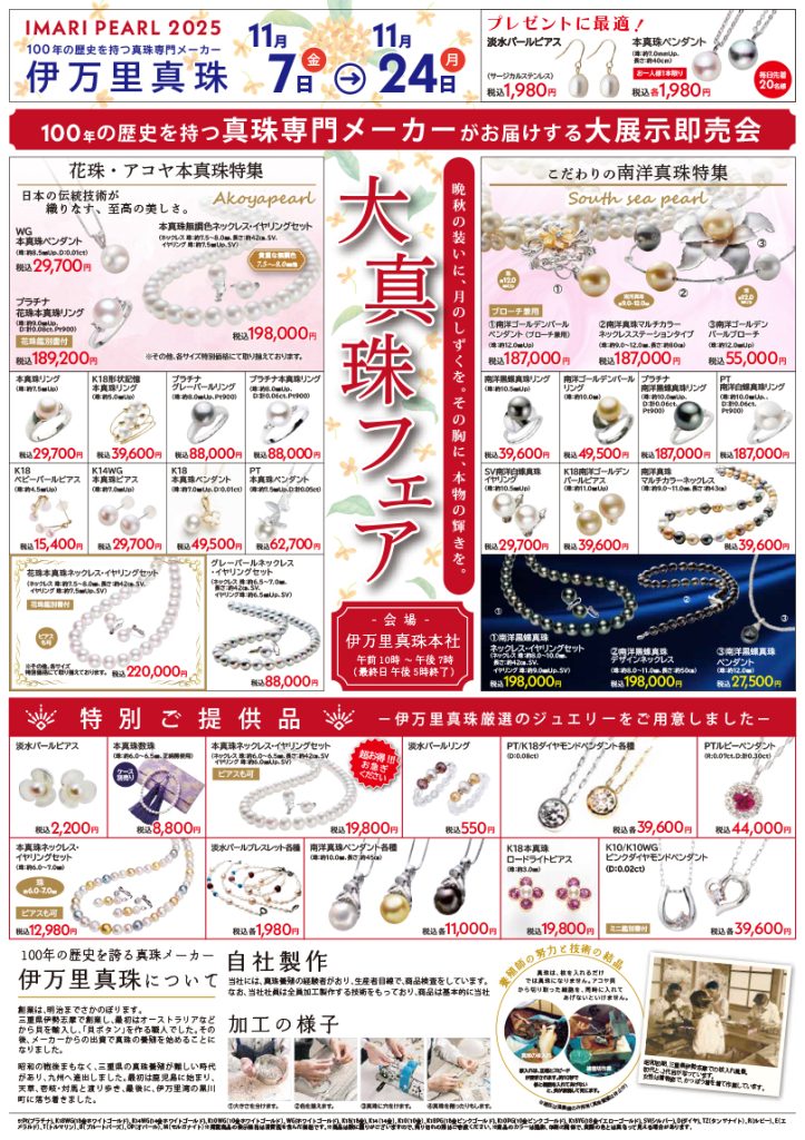 11月7日(金)から11月24日(月)まで、伊万里真珠本店にてパール&ジュエリーフェアを開催致します。