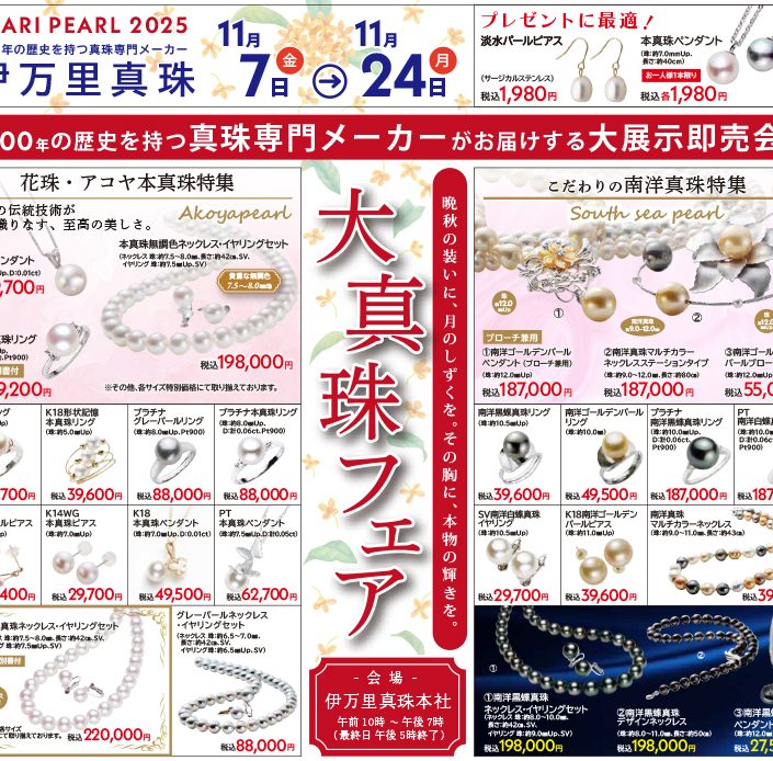 11月7日(金)から11月24日(月)まで、伊万里真珠本店にてパール&ジュエリーフェアを開催致します。
