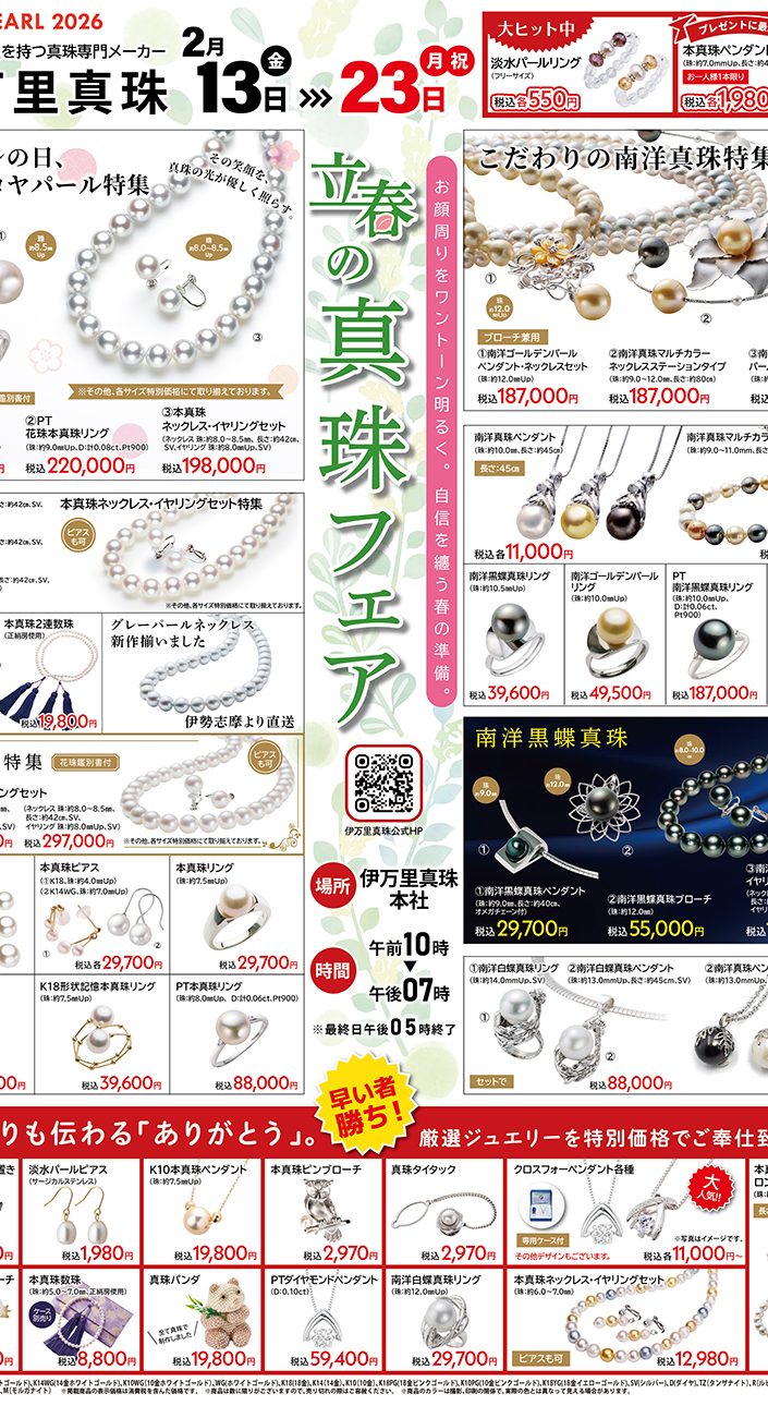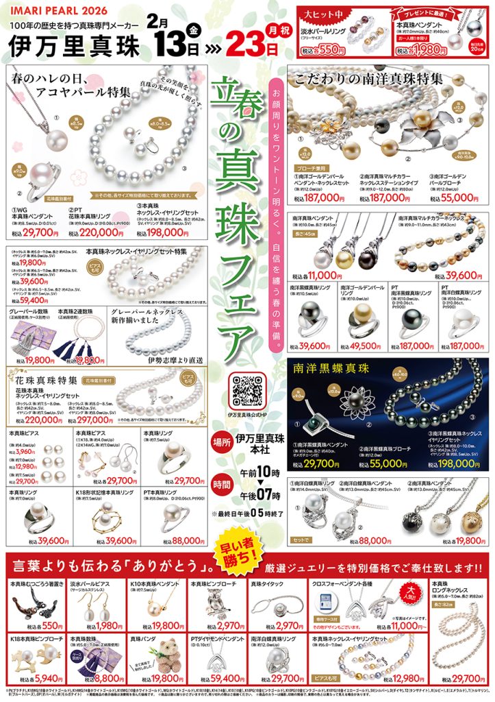 2月13日(金)から2月23日(月・祝)まで、伊万里真珠本店にてパール&ジュエリーフェアを開催致します。