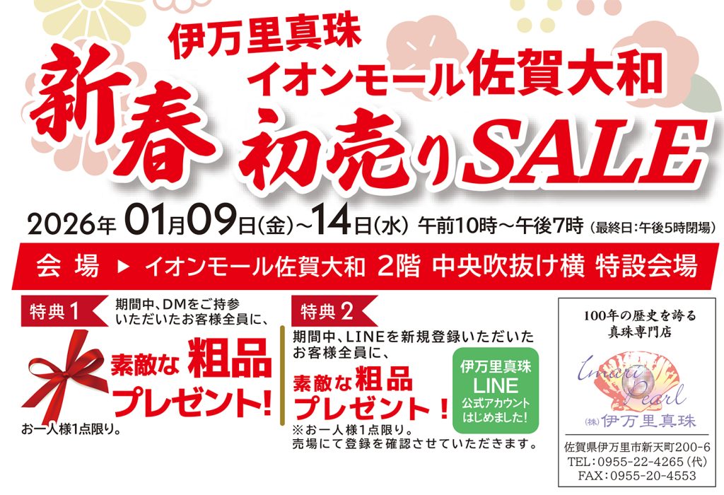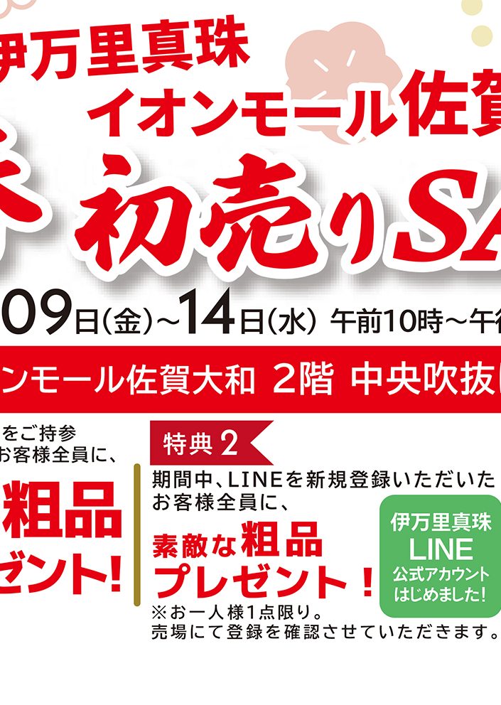 1月9日(金)~1月14日(水)まで、イオンモール佐賀大和店 2階 中央吹抜け横 特設会場にて新春初売りフェアを開催致します。
